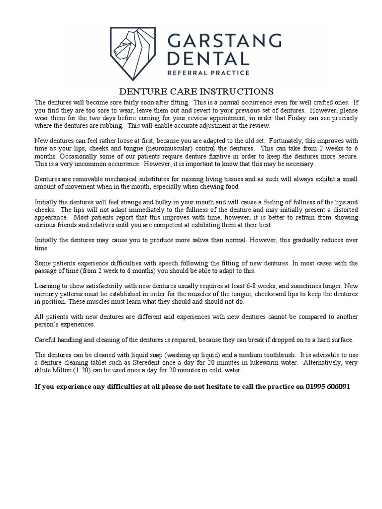 Denture Care Instructions PDF Dentures Mouth